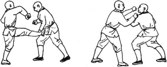 他用铁头来撞我的面部,我飞左脚假取裆(图184)。乘他 顾裆防下之际,我猛出右拳击他胸,他必用左拳挡,我再飞出左 手点击他前额上部正中上星穴(图185)0