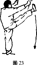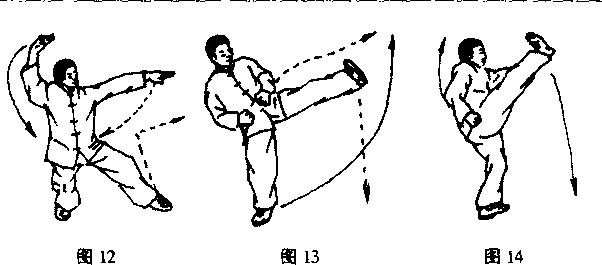 右腿直立左腿收回抬起上体微右倾两手抓抱于两腰侧不停左脚向左侧跪出脚高于腰脚尖勾起力在脚跟视左前方口(图13)