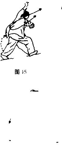 右脚落地内扣左脚脚跟抬起脚前掌着地同时右手匕摆左手里合掌心向下目视左上方。(图15)