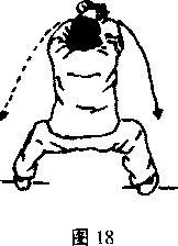 下肢不动两拳变掌下落、里合至腹前交叉上架于头上方,掌心向外左手在里右手在外目视两掌口(图18)