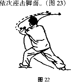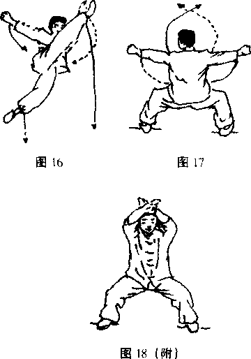 上动上停左脚抬起屈膝右腿蹬地起跳腾空转体一周左手拦击脚掌。(图16)