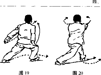 重心右移成右弓步上体微右转同时两掌分别向体两侧卜砍掌曲视右前方口(图19)
