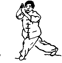 左脚落地右脚下落踏实与左脚相距三脚宽膝半蹲,重心在两腿中间膝部不超过脚尖两膝微内打全脚着地两手分别抱拳收于腰间不停两拳内旋同时向左右撑拳拳眼向上高与肩平目视左拳。(图)