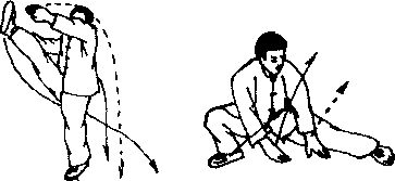摆莲腿外摆一周落地后成仆步同时两掌向下拍地视两学(图33)