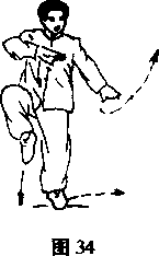 号体直立重心左移左腿支撑右腿屈膝抬起同时石手贴身向,提掌左掌向左摆动口(图)