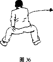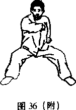 重心前移左转左脚外展右脚左前上步两腿屈膝成马步同时左掌内旋向前、向左摆掌握拳收抱于腰间拳心向右掌变拳屈臂二抬随左转体向前顶肘目视肘尖口(图36)