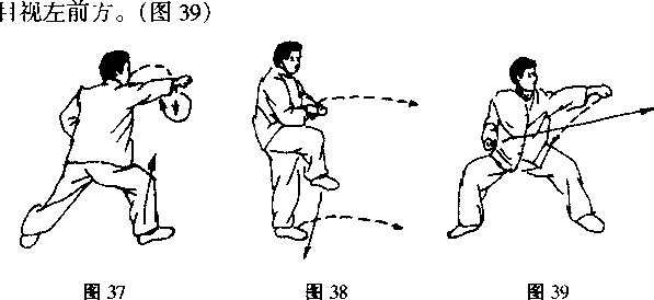 重心右移右脚尖外展左脚尖内扣左腿蹬直同时右拳向右摆拳奉心向下目视右前方口(图37)