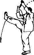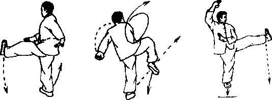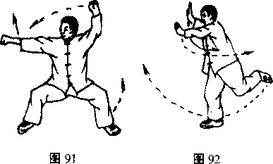 左脚向前上步重心前移右脚向前摆踢同时右手顶击左学心后向下拍击右脚面(图89、90)