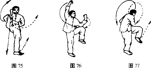 卜动不停上体微左转右脚下落行腿直立支撑左腿屈膝提起同时足拳屈肘左前摆拳面向-拳心向电肘部落左膝上右拳向右向上摆于头上方拳面斜向左拳眼斜对左拳轮出视左拳二(图76)