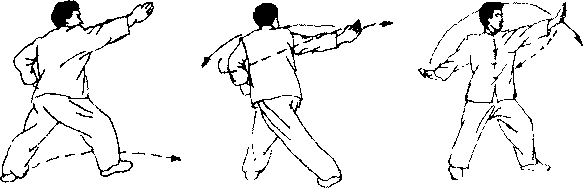 上动不停左脚抬起经右腿后向右插步同时右掌继续向下向左、向上向右摇劈一立圆上体微右转口(图?7)