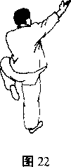 上动不停右掌向前上经左掌背上穿掌掌心斜向匕高于头同时左掌顺右臂收于右胸前成立掌下肢不动目视右掌口(图22)