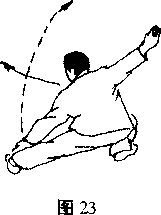 上动不停上体微左转右腿屈膝全蹲左腿向左贴地平仆脚微内扣同时左掌顺腿里侧向前下穿掌右掌微内旋目视左掌口(图23)