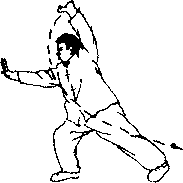 上动不停身体左后转体180度由右弓步转成左弓步同时左拳变掌随转体向上、向前劈掌掌根斜向卜,右掌随转体后摆视左前方。(图18)