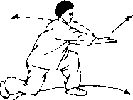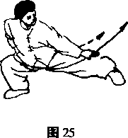 身体左转重心前移左腿屈膝半蹲右腿成跪梦同时,右掌外旋向前撩掌掌心向下左掌拦击右肘掌心向下,目视右掌口(图26)