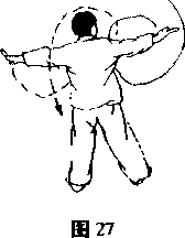 身体直立右脚向前上步脚内扣转体90度同时后学随上步转体向右平伸掌心仍向上左掌内旋向上、向左摆动掌心向下-(图27)