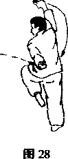 上动不停右脚支撑左腿屈膝前抬脚面绷平同时右学继续向上、向左、向卜、向右、向上抖腕横掌摆架于头上力左掌在右掌摆动时向下、向右、向上、向左、向身后摆动,由掌变勾手目视左侧方口(图28)