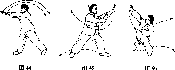 匕动不停重心微左移两掌向上、向左、向摆与肩平(图45)