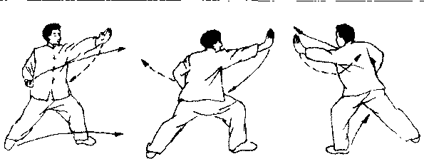 上动不停身体左后转体180度左脚外展,左腿屈膝成左弓步右脚内扣右腿挺膝蹬伸同时左拳变掌内旋随转体向左直臂推掌掌心向前掌指向上右掌变拳内旋收抱于腰问臼(图49)