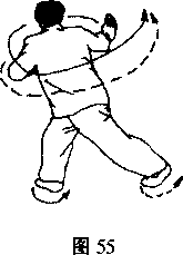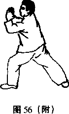 左脚向右后插步前脚掌着地脚跟抬起。(图55)