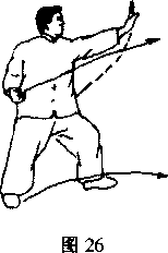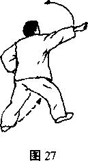 上动不停右脚向前上步屈膝成右弓步同时左掌外旋握拳收抱于腰间拳心向上右拳内旋直臂前冲拳心向下,目视右前方口(图27)