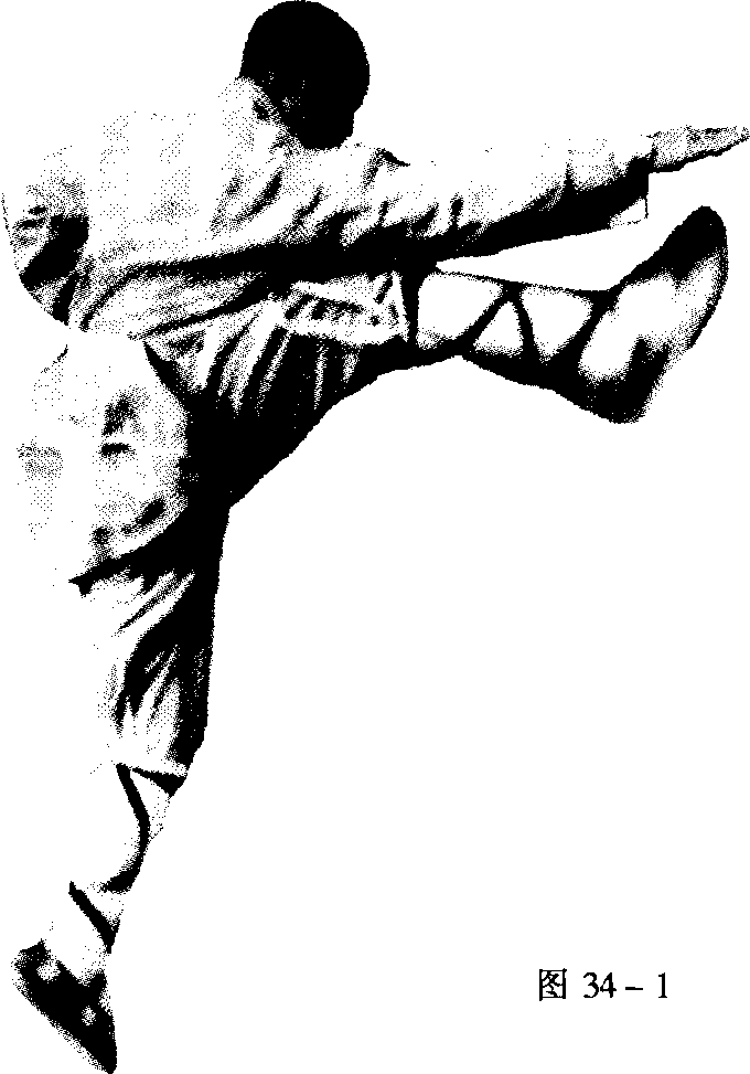 右转身90度,左脚上于右脚左前,下蹲成七星步,同时左 掌变拳转身下蹲,直臂下杵至左小腿前;右掌向左拦至左肩 前,掌心朝左,指尖向上,目视左前方。(见图33)要领:右掌左拦,左脚随转身撩地前移,右膝紧靠在膝下 护裆,右立掌护脸,身法更快,缩身要小。