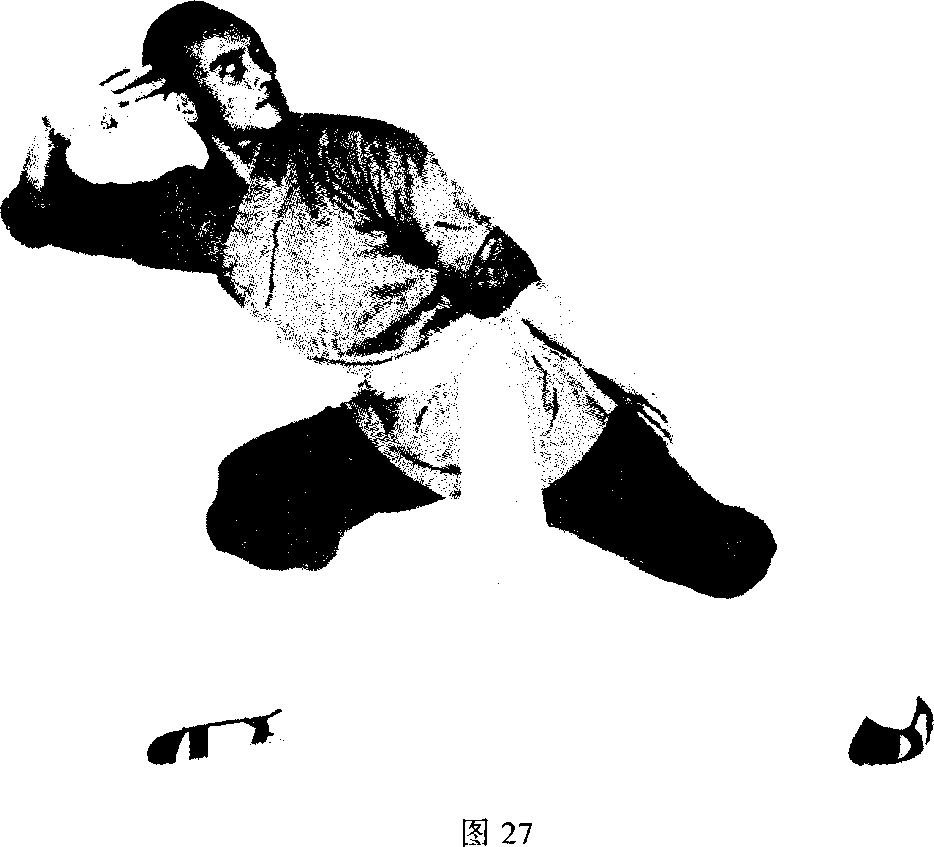 左膝用力向上提起。双拳拳心朝上收于腰间Q左脚下落 时,右脚提起绷直向前上方用力弹踢,右拳变掌前伸,以掌心 击打右脚面,目视前方。(见图26)