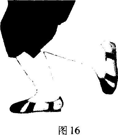 身体立正站直,右 脚向前半步,膝盖微曲, 左脚抬起,脚尖离地,膝 盖向前弯曲。(图16)