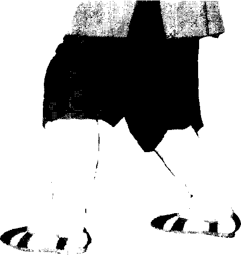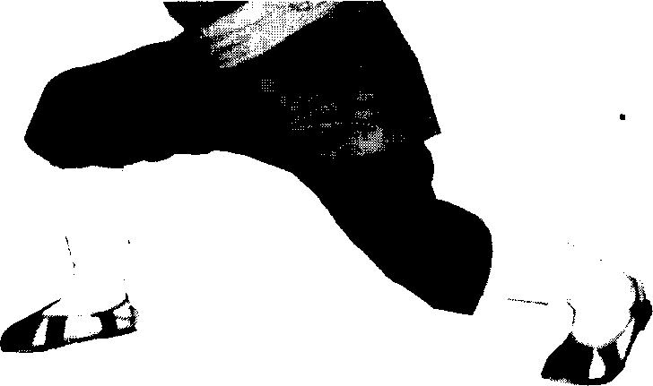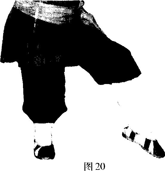 身体直立,双脚微分,与肩同宽,右脚向前跨出一大步, 脚掌抓地,大腿弯曲,左脚不动,前脚掌着地,脚跟离地,左 膝成下跪式。(左右变换)(图19)