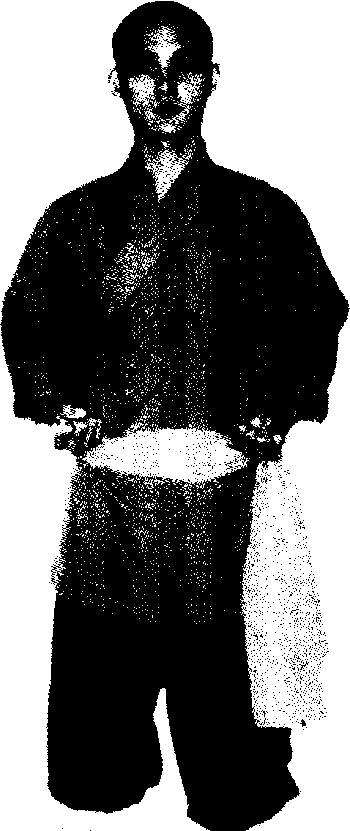 左脚落地后,右脚落于左脚处并用力震脚,左脚再向左跨 一步。同时右掌变拳下落弧线形向右后上方抡起,架于头顶 上方,拳心朝前。左拳朝内侧经胸前抡劈,放于左腿上方。双 腿下蹲成马步。向左摆头,目视左方。(见图38)要点:右震脚时,口发“喂”声,丹田气呼出,右拳上架时力 达小臂,小臂向外向上翻转C