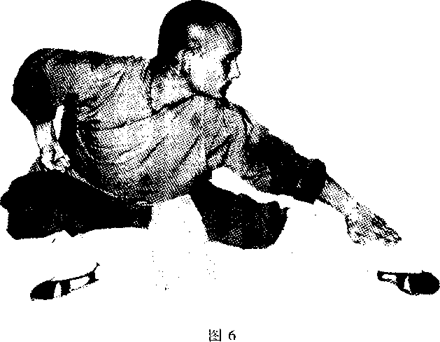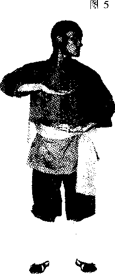 重心左移右脚向左并步起身两脚与肩同宽同时左掌向右掌心朝上收于腹前右拳变学放于胸前掌心向下目视左方二(见图5)要点吸气起身要快