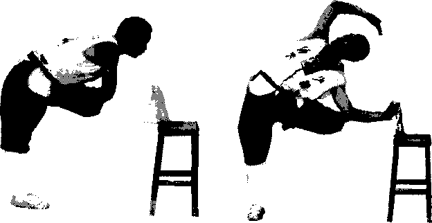 面对支撑物站立支撑物或石或木或椅等左脚跟放在支撑物上脚尖勾起两手扶按膝上。两腿伸直立腰,收虢上体前屈并向前、向下做振压(图14)。练习时左右腿交替进行口
