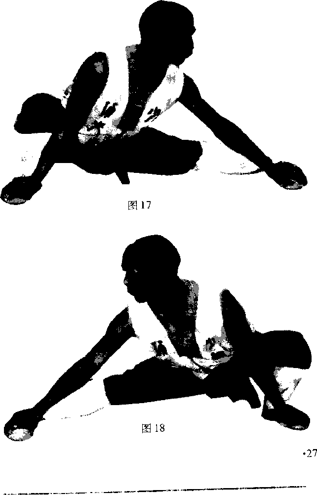 两脚开立右腿屈膝全蹲全脚着地左腿挺膝伸直脚尖里扣。然后两手分别抓握两脚外侧成左仆步(图17)口右脚蹬地伸膝重心左移左腿弯屈转成右仆步(图18)。练习时左右仆步交替进行。