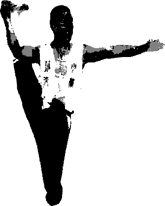 身体侧对支撑物站立左脚放在支撑物匕脚尖勾起。右臂上举右掌侧于右胸前。两腿伸直立腰开髓上体向左侧振压(图15)。练习时左右腿交替进行。
