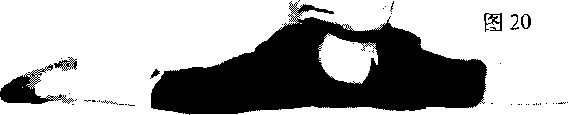 两手左右扶地或两臂平举两腿前后分成直线左腿后侧着地脚尖勾起右腿的内前侧及右脚背着地(图20)。左右交替进行