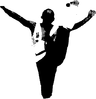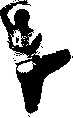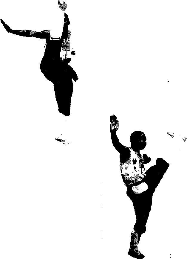 图23斜踢腿两脚并立右掌向头上、左掌向右腋猛甩同 时右脚向前半步右腿支撑左脚勾紧向鼻侧耳际猛踢。两眼向前平视(图23)。练习时左右腿交替进行。要点挺胸立腰要有爆发力。侧踢腿