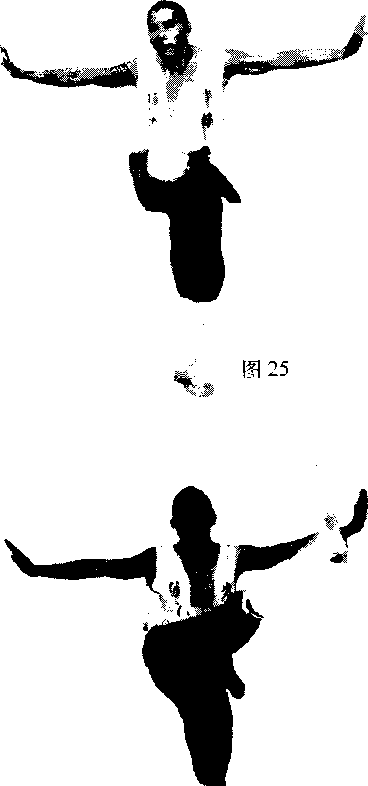 两腿并立两臂成立学平举(图21)口左脚向前走半步左腿支撑右脚勾紧脚尖用足力气向前额处猛踢前眼向前平视(图22)练习时左右腿交替进行。
