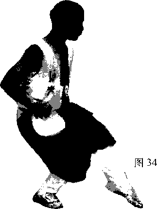 仆步两脚左右开立。右腿屈膝全蹲大腿和小腿靠紧臀部接近小腿全脚着地腿和膝外展左腿挺直仆平脚尖里扣,全脚着地。两手抱拳于腰间。眼向左方平视(图35)。仆左腿为左仆步仆右腿为右仆步口一要点挺胸塌腰沉懿要点挺胸塌腰虚实分明。|少林寺连环拳