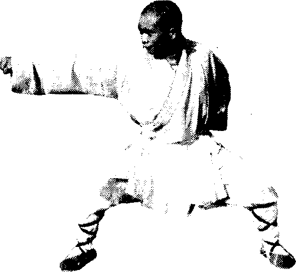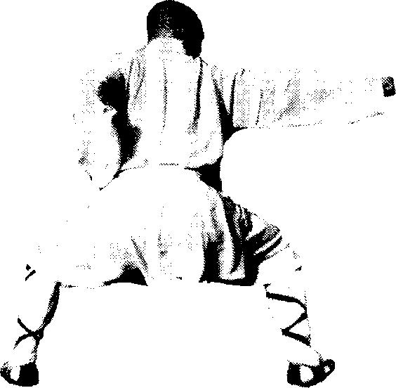 重心前移提右膝勾右脚尖直腿向前猛蹬口同时左拳平臂前击拳心向下右拳收腰侧拳心向上目前视。(见图3-要领出拳、收拳与蹬腿用一个力量同时完成。图3—2背回右脚向前落地体左转90度下蹲变马步。同时左拳收于腰侧右拳向右平臂猛击拳心向下目视右拳。(见图3-2)要领右拳冲出左拳收回要与转身同时进行同时呼气力达拳面。图4背向