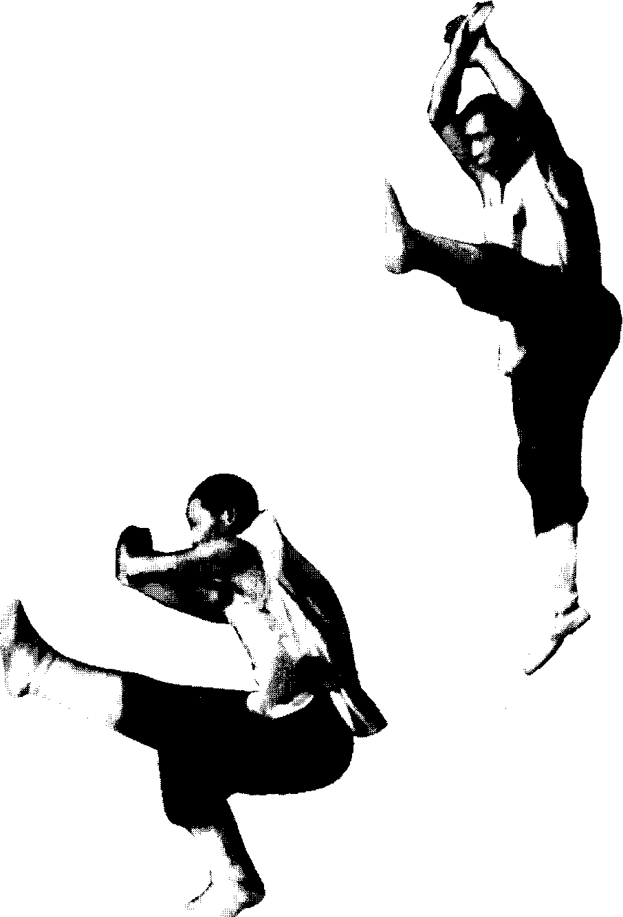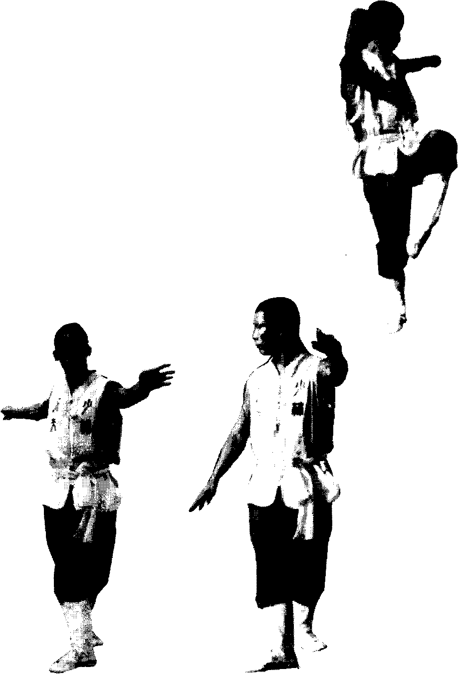 图48图48右腿蹬伸上跳,左腿屈膝提 起收扣于身前,身体腾空。右臂在 跳起的同时,经下向上弧形斜上 举,左臂顺势摆向身后;两腿随 右掌转向右侧,头部左转,右肩前 顺(图48)。右脚落地,左脚随之 身前落步,右脚再进一步,足尖外 展;身体右转,同时右臂顺势下 落,左臂前摆。(图49、50)