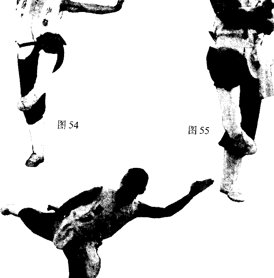 并步站立,两臂左右伸直,两手成立掌。右臂上举,右 腿伸直支撑,左腿提膝要过腰,绷紧脚面,垂扣于右大腿前; 两眼向左平视。(图54)要点:平衡站稳,提膝过腰,脚内扣。2.燕式平衡右腿屈膝90度提起,两掌胸前屈肘交叉,掌心向内(图 55)。两掌向两侧直臂分开平举,上举前俯,右脚向后蹬伸, 成燕式平衡。(图56)要点:两腿伸直后,举腿高于头顶水平部位,脚面绷平。 上体前俯,略高于水平部位,挺胸抬头。