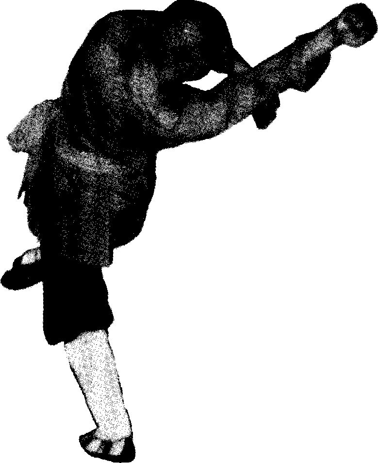 步法原地拨至右方,约一步,步形不变,右拳向右 后方抡至360度放于头顶右侧,左拳变掌抓住右前臂。 眼向前平视,发出呼气。(见图12)图13