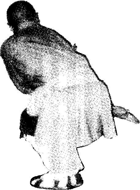 右手变掌,身体向右 微转。右手随之从面前划 过一个圆,掠过裆部置石 腿外侧,掌心朝外。左手同 时上撩,掠过面部成圆形, 再掠过裆部,放于右腋 To左脚同时回收与右脚 并齐,身体成半侧半蹲 式。(见图21-1)