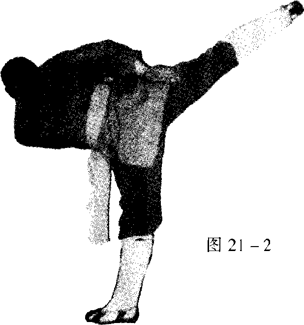 身体起立, 右手同时随之撩 起,收于右胯 侧。接着,腿向 右上踹出。(见 图 21 -2)