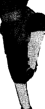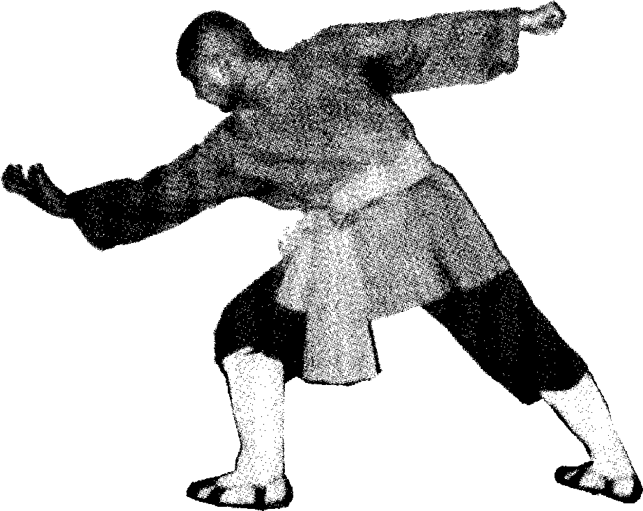 右脚落地,右拳用 力向右冲出,拳心向 下,同时提左膝护裆, 左拳拳心向下横架于膝 盖上方。目视左方,两 肩齐高。(见图22)图22面向图 23 - 1