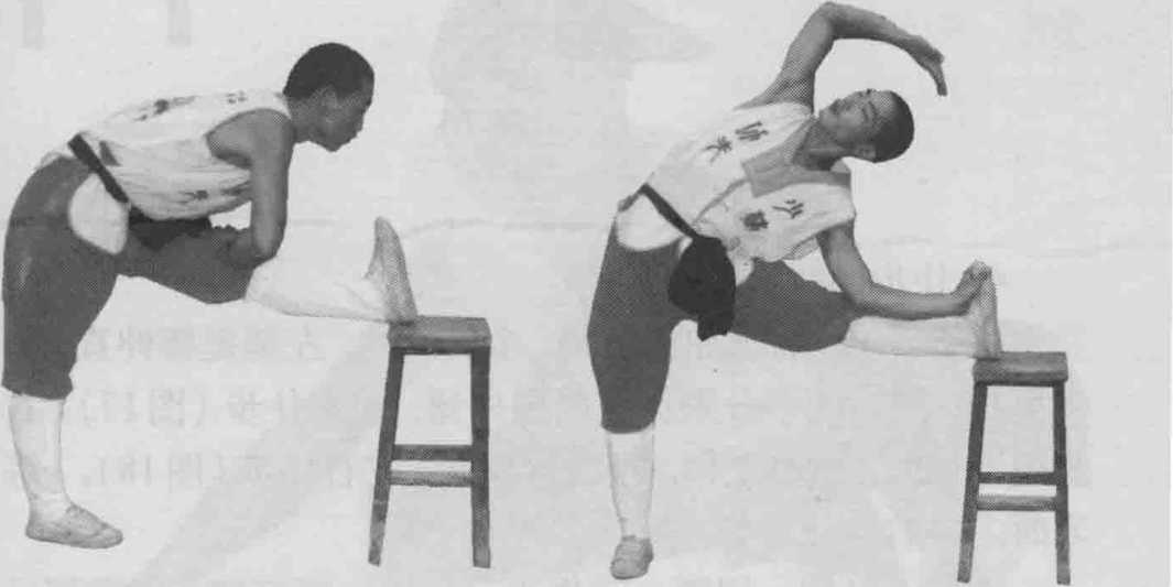 身体侧对支撑物站立,左脚放在支撑物上,脚尖勾起。右 臂上举,右掌侧于右胸前。两腿伸直,立腰,开髓,上体向 左侧振压(图15)。练习时,左右腿交替进行。