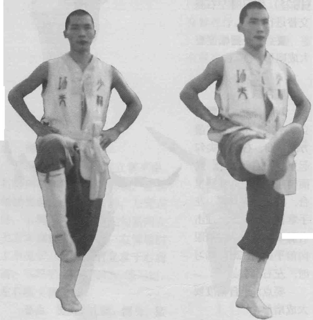 两脚并立,两手叉腰。右腿屈膝提起,大腿与腰平,右 脚绷直(图27)。提膝接近水平时迅速猛力挺膝,向前平踢弹 击,力达足尖,大腿与小腿成一直线,高与腰平,左腿伸直, 双眼平视(图28)。左右腿交替进行。