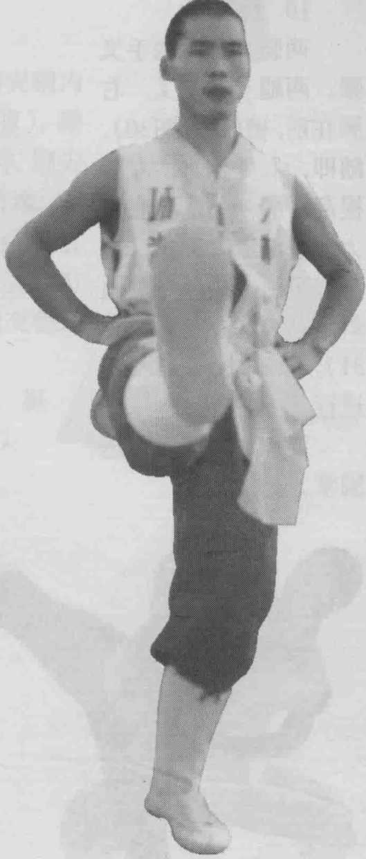 两腿并立,两手叉 腰。两腿左右交叉,右 脚在前,稍屈膝(图30)。 随即,右腿伸直,左腿 提起,脚内扣,脚底用 力向左侧上方踹出,高 与肩平,上体向右侧倾 斜,双眼视左侧上方(图 31)o练习时,左右交替 进行。