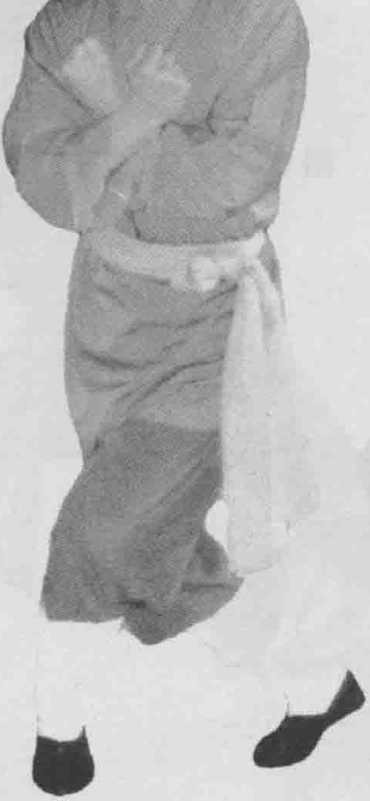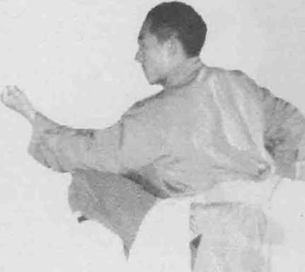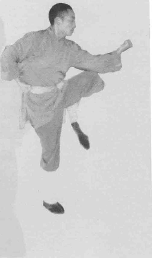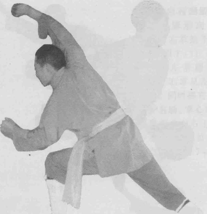 震右脚,左脚回扣右腿弯处,同时掌变拳,收于腰两侧,拳 心向上,目视前方。(见图8-1)图8-2接上动不停。上左步呈左弓步,身体向左前倾,同时两 拳从腰两侧向前猛冲,右臂横架于头上方,左拳从腰处向前 直冲,微弯曲,使两拳眼相对,拳心向前,目视左前方。 (见图8-2)图8-3面向图8-3面向图8-3背向图8-3背向提左膝,右腿直立, 右拳收至右腰侧,左拳 收至左肘与左膝相合 处,两拳拳心向上,目视 前方。(见图8-3)图8-3面向图8-3面向图8-3背向图8-3背向图9- 1