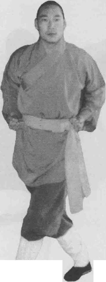 左脚向前落一小步,同时,身体向左转90度,两小臂交叉 在胸前,左拳在内,右拳在外,两拳拳心向内,目视前方。(见图 9-1)