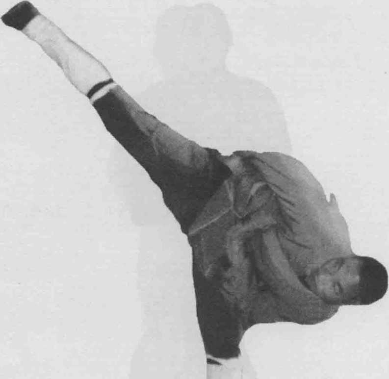 向右上方踹右腿,上身向左下倾斜,同时左拳变掌护 裆,右拳变掌贴于右大腿外侧,力透脚跟,目视前方。(图 9-3)